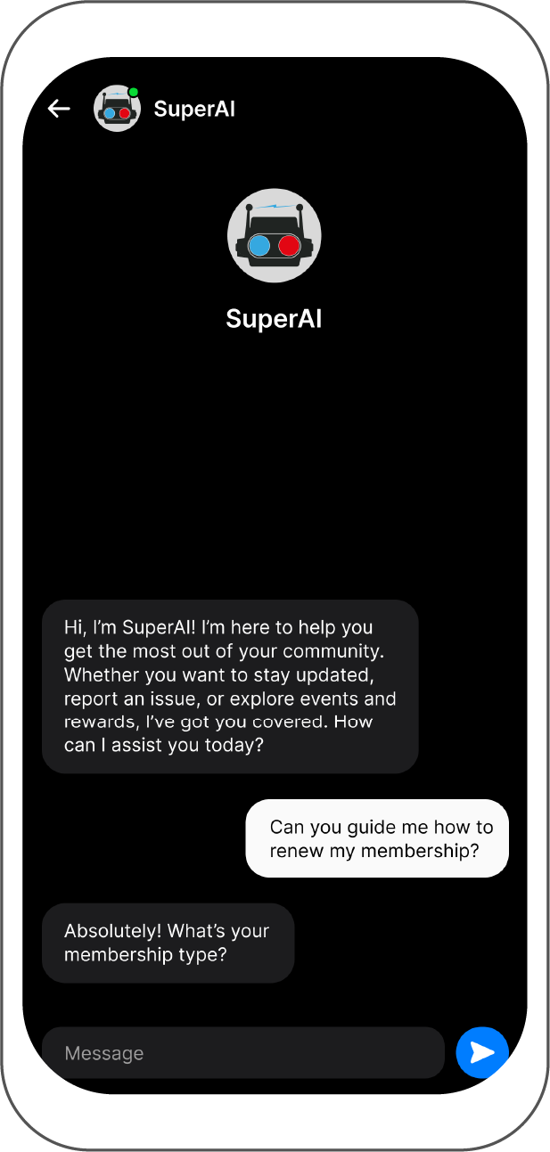 Experience personalized assistance with SuperAI, your AI-powered community concierge. From managing daily tasks to providing insights and recommendations, SuperAI enhances your app experience by making it smarter and more intuitive.